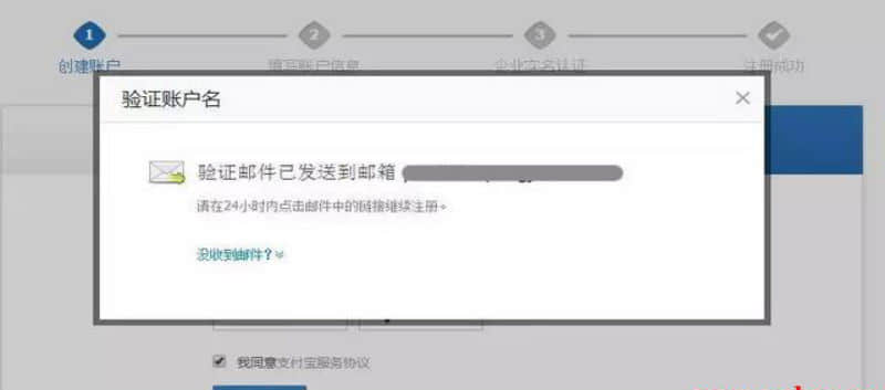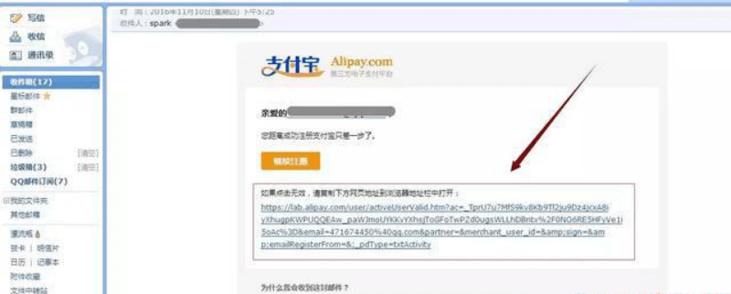 第五步:系統(tǒng)會(huì)將驗(yàn)證郵件發(fā)送到之前填寫的郵箱。登陸該郵箱,在收件箱找到來(lái)自支付寶的郵件,并點(diǎn)擊網(wǎng)址鏈接,完成郵箱郵件驗(yàn)證。