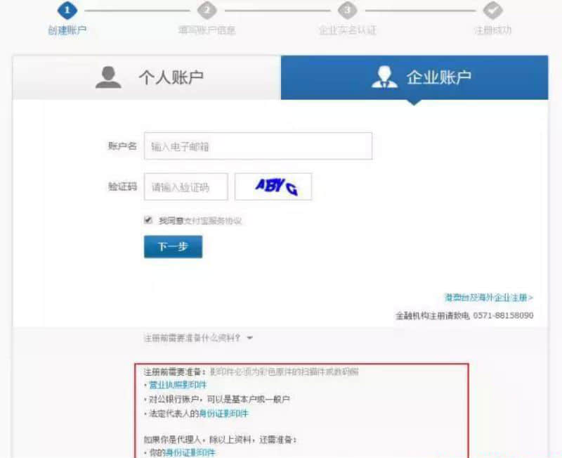 第三步:選擇"企業(yè)賬戶",按照要求輸入郵箱和后面顯示的驗(yàn)證碼,完成后點(diǎn)擊下一步。紅色框選部分要特別注意,包括企業(yè)營(yíng)業(yè)執(zhí)照和對(duì)公銀行賬戶等資料的準(zhǔn)確性。