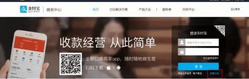 第二步:已有支付寶賬號(hào)的商戶可直接登陸,沒有商戶點(diǎn)擊右下角“注冊(cè)”。