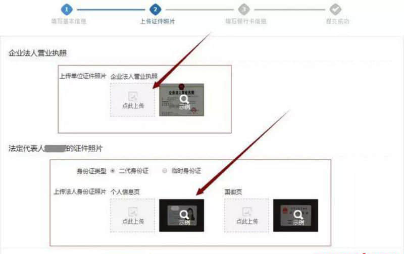 第四步:上傳證件照片,包括“企業(yè)法人他營(yíng)業(yè)執(zhí)照”、“法定代表人的證件照片”,完成之后點(diǎn)擊“下一步”。