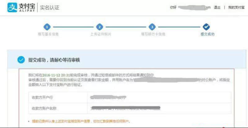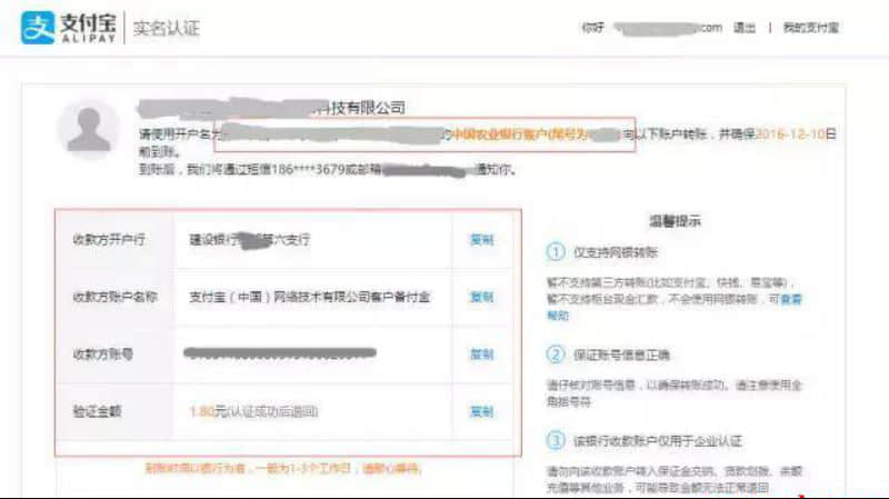 **步:2天內(nèi)收到系統(tǒng)“審核完成”的提示之后,登陸賬號(hào),并根據(jù)上面的提示,用之前提交的對(duì)公銀行賬戶向指定的支付寶收款賬戶充值1.08元,完成驗(yàn)證。