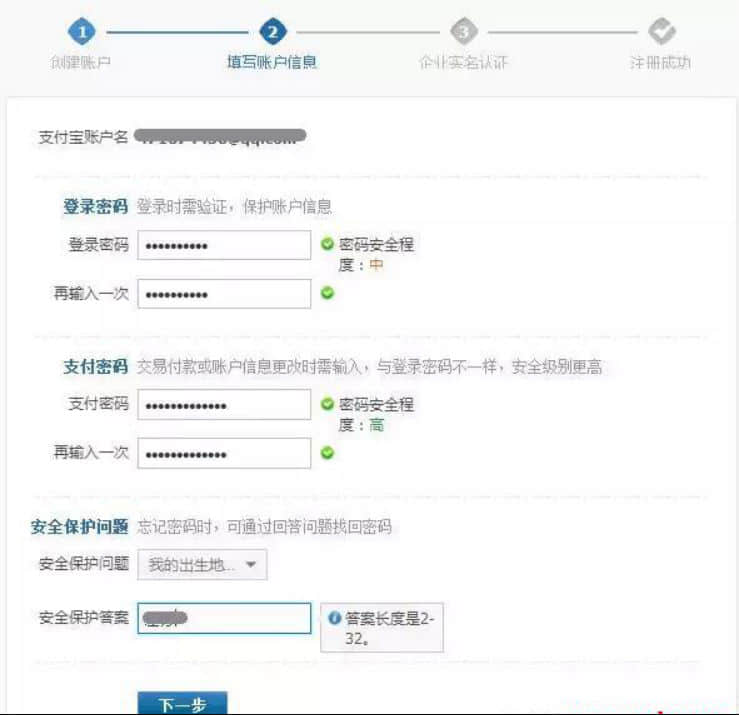 **步:按要求設(shè)置“登錄密碼”、“支付密碼”和“安全保護(hù)問(wèn)題”(密碼設(shè)置**使用數(shù)字、字母、符號(hào)的組合,增強(qiáng)安全系數(shù),自己設(shè)置的問(wèn)題要記得答案),完成后點(diǎn)擊下一步。