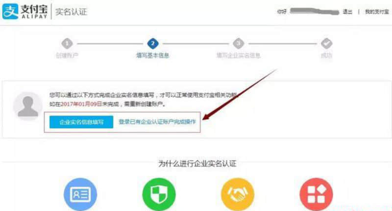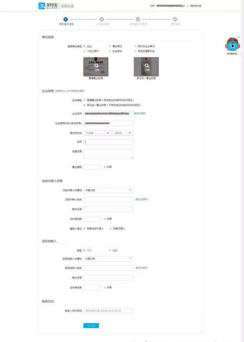 第二步:支付寶賬戶信息填寫完之后,進(jìn)入企業(yè)實(shí)名信息填寫。