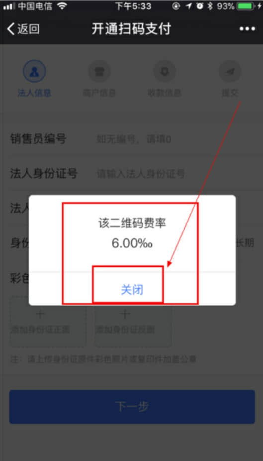 4、點擊進入“開通掃碼支付”頁面,此時系統會彈框提示“二維碼費率為6.00‰(100元0.6元)”,不予理會,直接點擊關閉即可。