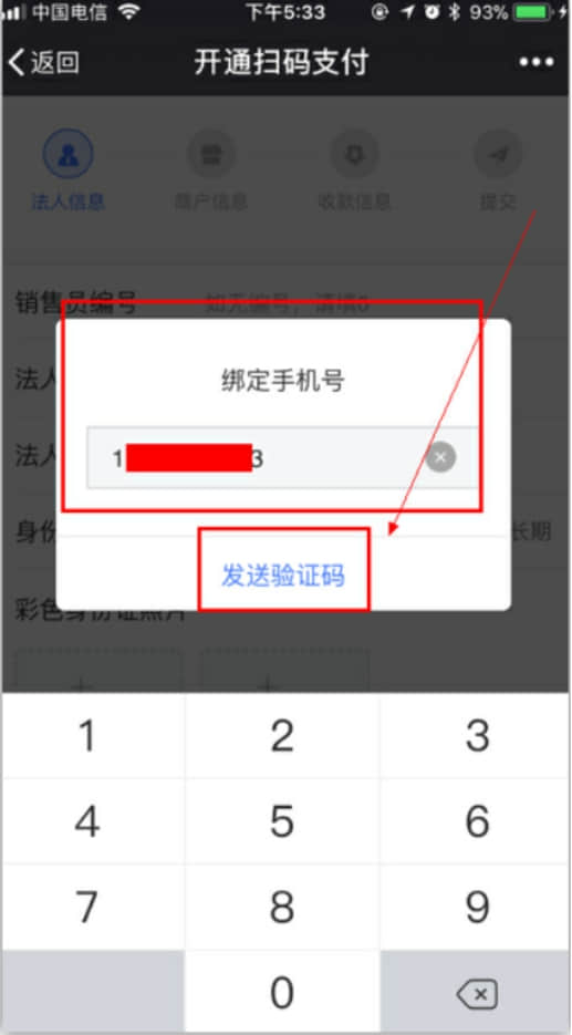 5、輸入手機號碼》》》發送驗證碼》》》輸入驗證碼;建議填寫商戶老板或者負責人的手機號。