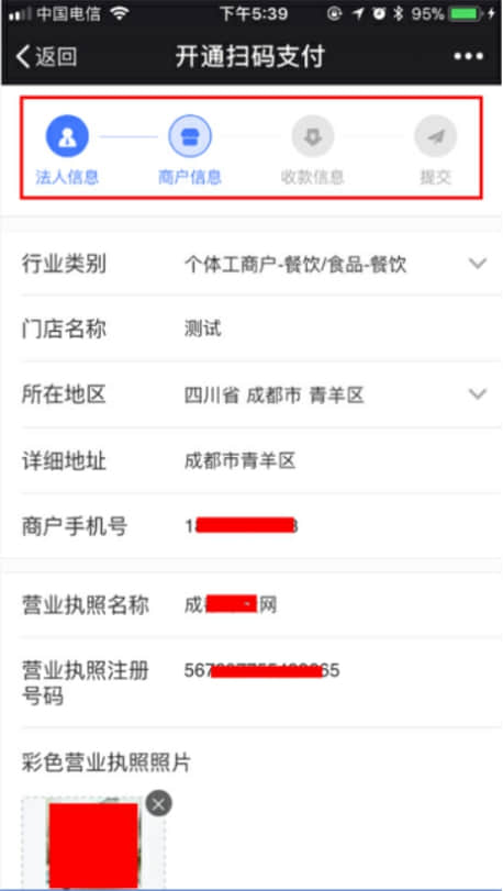 6、根據要求填寫對應的 法人信息、商戶信息、收款信息,填寫完成后點擊提交。